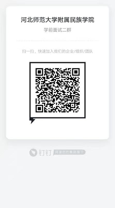 2021年学前教育五年一贯制公费师范生招生面试,参与考生分为两组:石家庄、承德、唐山、廊坊、秦皇岛、衡水考生为一组。保定、沧州、邢台、邯郸、定州、张家口、辛集考生为二组。请各位考生依据分组情况,选择扫描面二维码进入相应钉钉视频面试平台。认真阅读平台群公告要求,按照工作人员提示做好备考工作。
