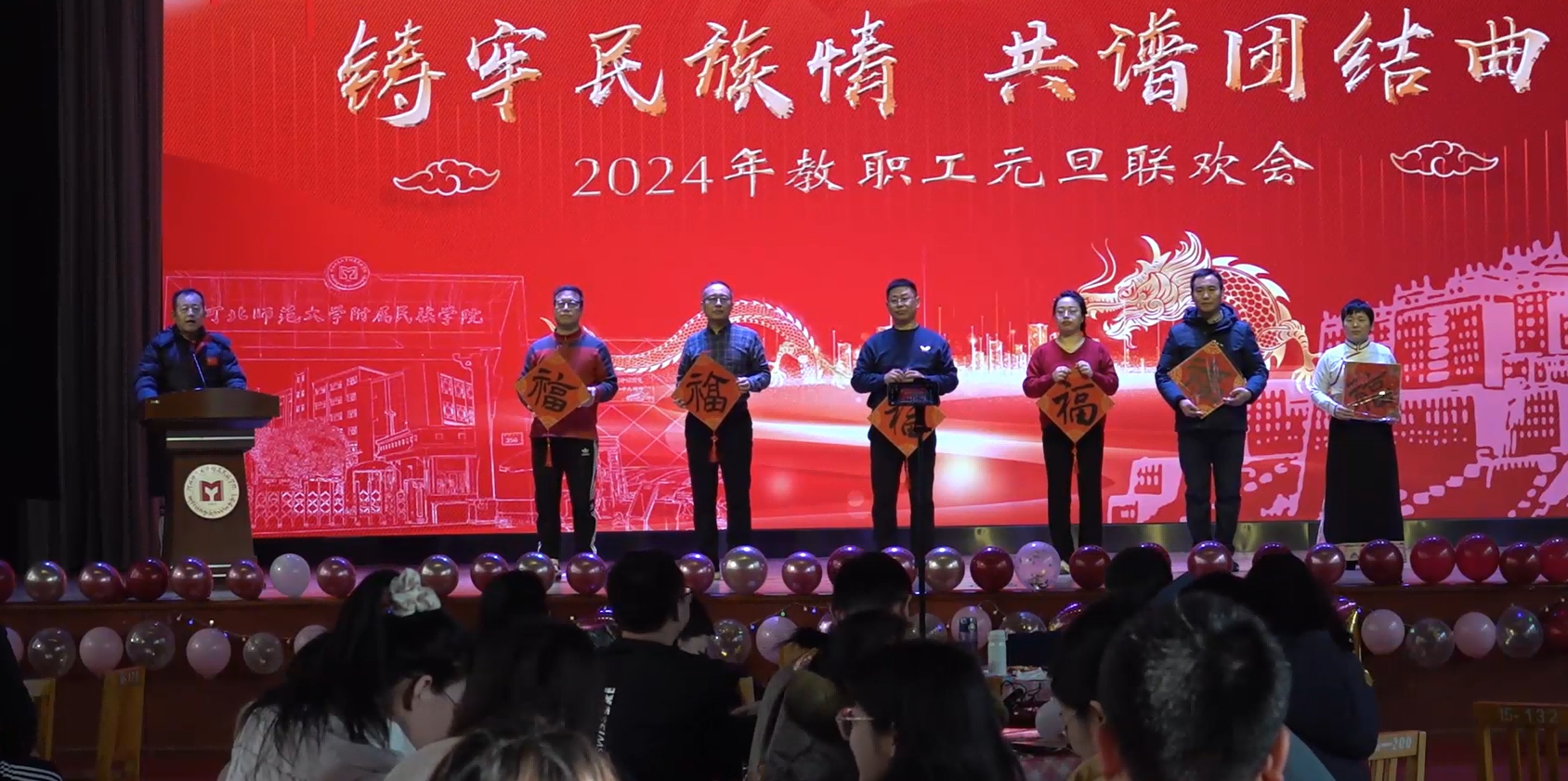 体育馆张灯结彩,一派喜庆祥和。院长刘森,党委书记白少双,副院长李保堂、乔庆刚、王晓晶为步入会场的教职工们亲手送上福卡,送上暖心祝福。联欢会在《2023年民院人的专属回忆》视频展示中拉开帷幕。院长刘森致新年贺辞,他指出,2023年全体教职工齐心合力,追求卓越,学院转型升级创新发展各项工作成绩喜人,这些成绩的取得是全体教职工倾情付出的结果。希望在新的一年,全院上下以铸牢中华民族共同体意识为主责主线,凝心聚力,携手同行,创造学院更加灿烂的明天!领导班子成员集体登台,向全体教职工表达诚挚的问候和美好祝福。
