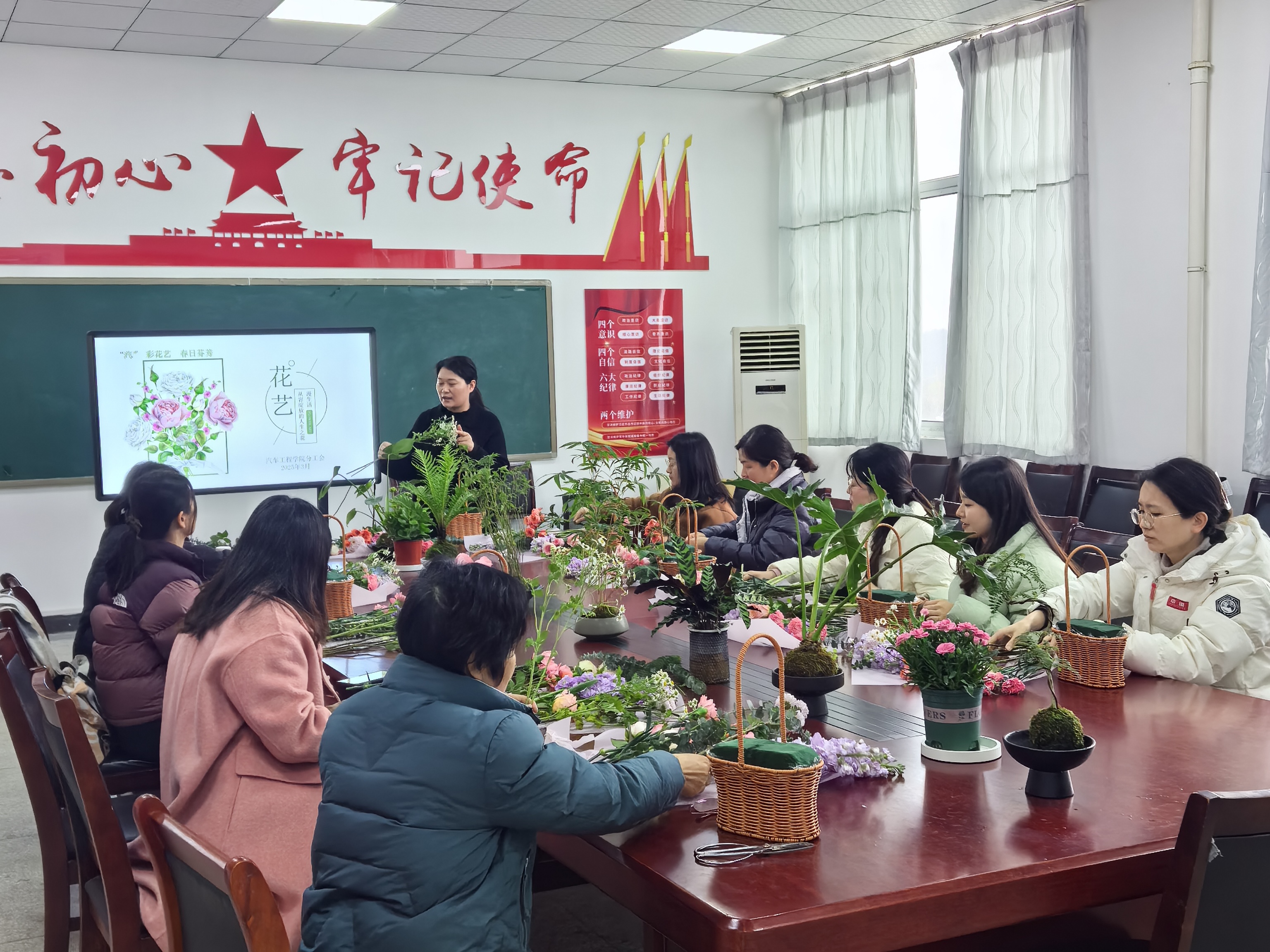 学院工会邀请了花艺师进行现场指导,从花材的选择、色彩的搭配到造型的设计,花艺师耐心细致地讲解每一个步骤,让参与者们在轻松愉快的氛围中掌握了插花的基本技巧。