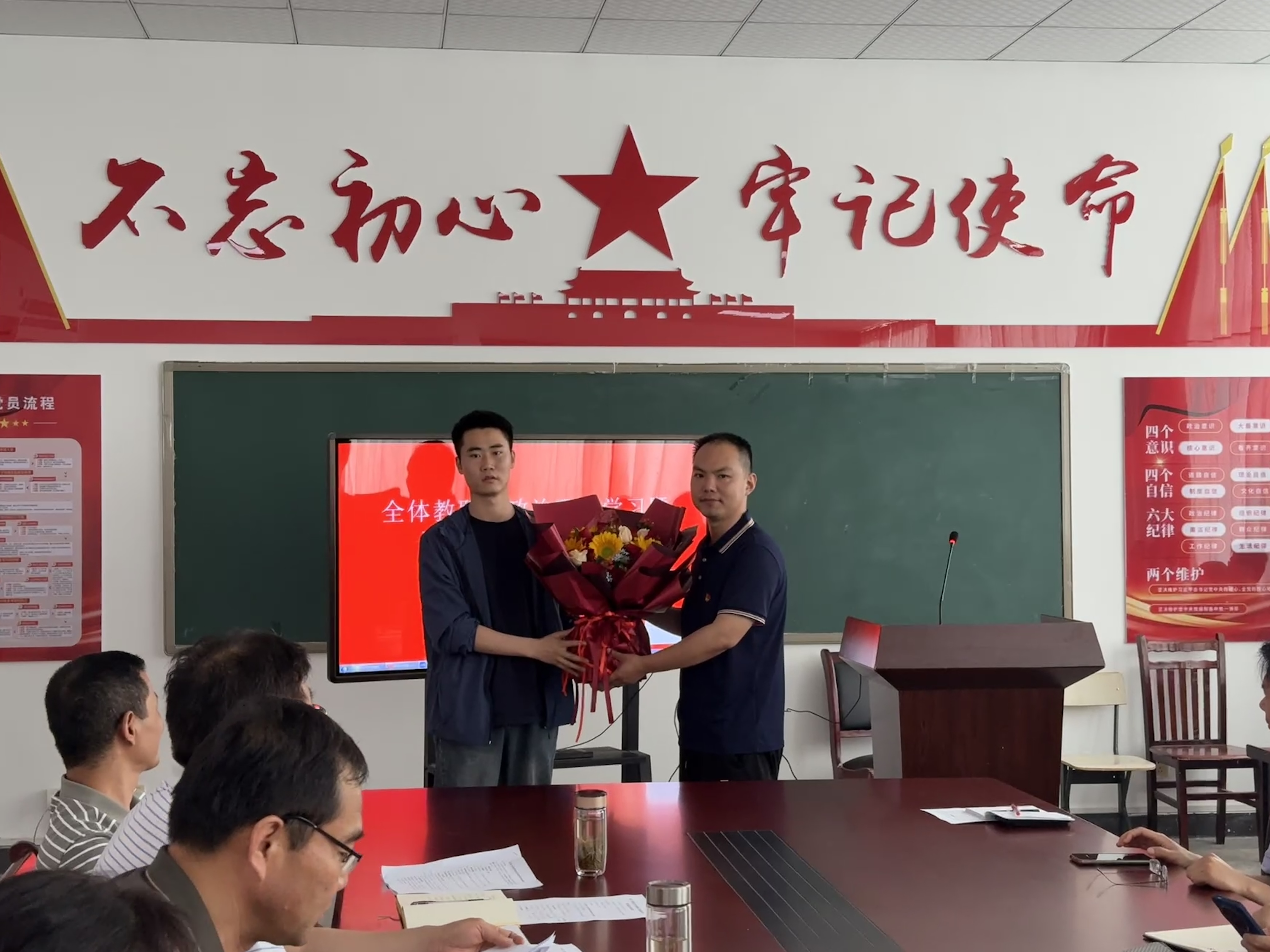随后,学生党员代表手捧鲜花走上舞台,向王老师致以崇高敬意。学生代表动情地表示,王老师不仅教会我们知识,更用行动诠释了什么是“学高为师、身正为范”。王老师接过鲜花后谦逊回应,表示愿做一盏灯,照亮更多学子前行的路。