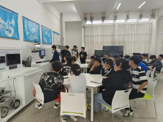 在活动负责人童晓红教授带领下,智能汽车专业兴趣团队小组负责人在二楼的智能网联实训中心向参观的老师和同学们介绍了现代智能网联汽车调试台架,详细分享了智能网联汽车激光雷达和摄像头的故障诊断以及车道偏离预警和车道保持系统,现场教学演示,理实一体化,由浅入深,声情并茂,帮助大家构建全新的智能网联汽车专业教学课程知识体系。