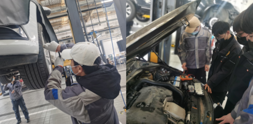 在见习的过程中,多岗位轮岗。同学们被分为汽车销售、维修接待、机电维修、钣喷中心、配件管理等多个岗位,安排企业导师全程指导,通过同学与企业导师的积极交流,将学校学到的知识进一步巩固,并在此基础上与实际结合,开拓扩展;在此过程中,发现自己的知识漏洞,从而“对症下药”,不断完善。