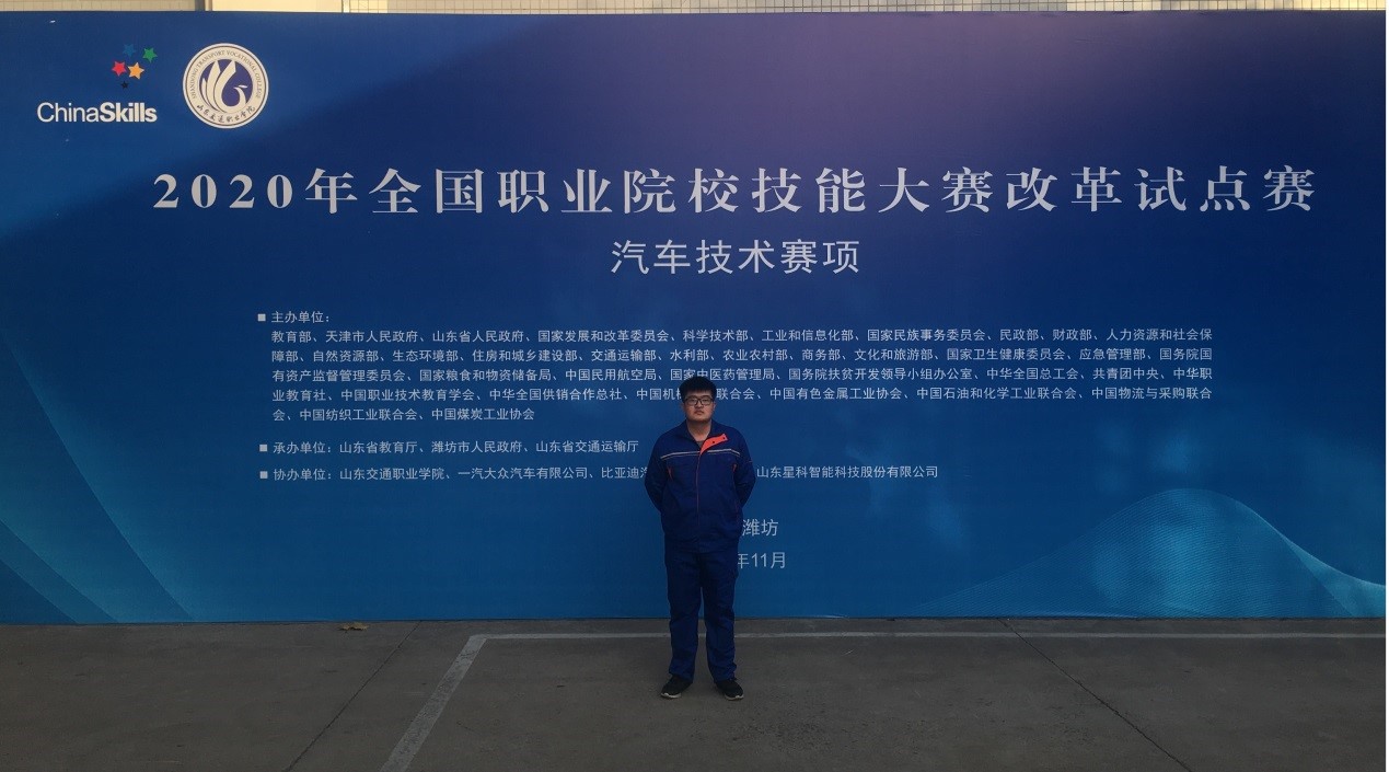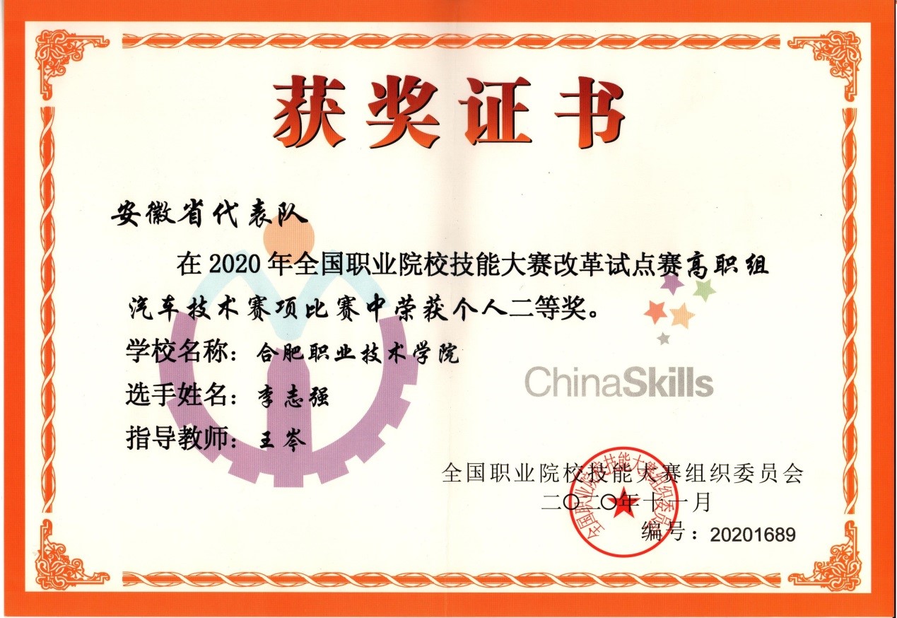 11月8日-9日,2020年全国职业院校技能大赛改革试点赛汽车技术赛项在山东交通职业学院举办,全国共有30个省代表队参赛,我校李志强同学代表安徽省参赛,经过两天的激烈角逐BB贝博艾弗森官方网站取得全国第5名,李志强同学荣获个人二等奖。