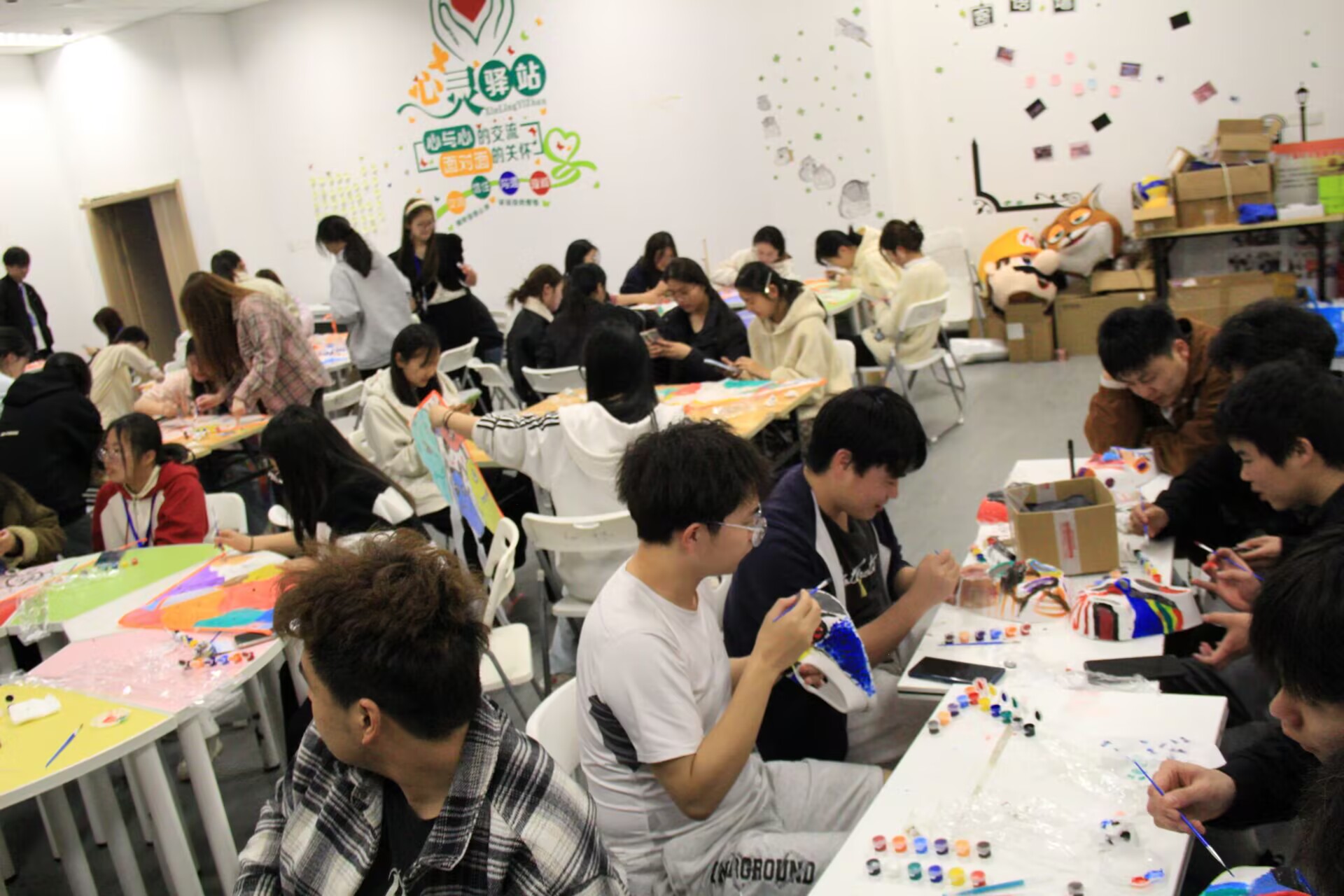 在“面具涂鸦”环节,同学们用画笔在空白面具上自由创作,以色彩和图案表达内心情感。有人用明快的色调描绘喜悦,有人用抽象的线条诉说迷茫,还有人通过暗色碰撞宣泄压力。活动结束后,大家围坐分享创作背后的故事,倾听彼此的心声。心理辅导员王桂年老师点评道:“面具是外在的‘保护壳’,而涂鸦让同学们敢于卸下伪装,直面真实情绪,这正是心理疗愈的关键一步。